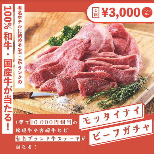 こちらの自動販売機は、これまでオンラインでのみしか購入できなかったモッタイナイビーフを初めてリアル店舗でお買い求めいただける場所となっております。「モッタイナイビーフガチャ」は1回3,000円で、ハズレなしで100%和牛・国産牛の商品が当たるお得なコンテンツです。