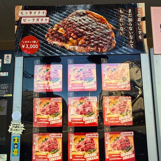 冷凍自販機で楽しめる「モッタイナイビーフガチャ」は1回3,000円で、ハズレなしでモッタイナイビーフの商品を購入することができるものです。