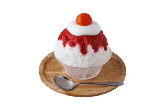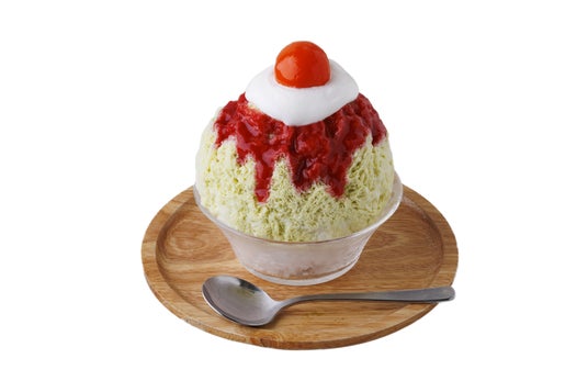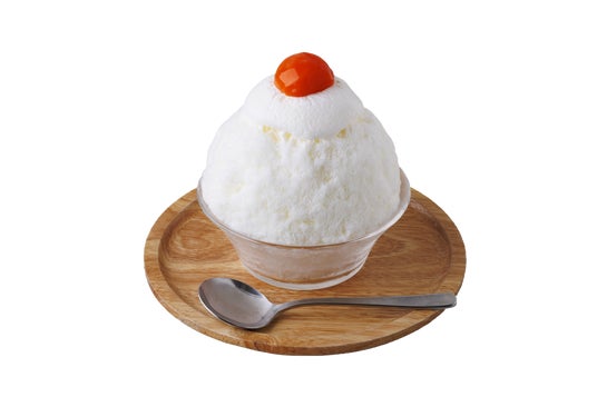 ・ミルク・いちご・抹茶・季節の4種の小さなかき氷、トップに甘いシロップに漬け込んだ卵黄。