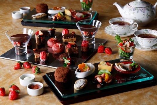 ショコラの甘みを活かしたドレッシングやソースなどを使用した、甘みと塩味の絶妙なコンビネーションが楽しめるセイボリーと、赤と黒のコントラストが目を引くデセール。"ショコラといちごのベリーヌ"は、温かい"ショコラショー"をかけると、中からアイスクリームが姿を現すライブ感溢れる演出をお楽しみいただけます。地上約100mからの景色と開放的な空間で、心ほどけるティータイムをお過ごしください。