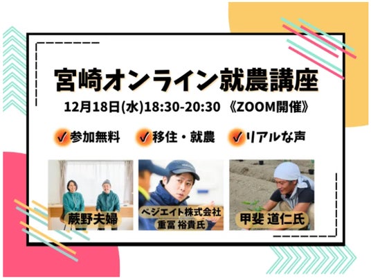宮崎県は、宮崎県外からの新規就農希望者の受入促進を目的として、(株)マイナビとコラボし、12月18日(水)午後6時30分から、オンラインで就農講座を開催します。