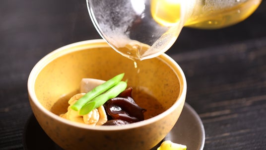 濃厚な白子や冬野菜の甘味・食感を存分に味わいながら、酢橘をお好みで絞っていただくと一層さわやかな風味が広がります。また、ガラスの器に残りましたお出汁は、素材そのものの旨味が凝縮された一品となっております。そのままお召し上がりいただきますと、出汁本来の味わいをご堪能いただけます。