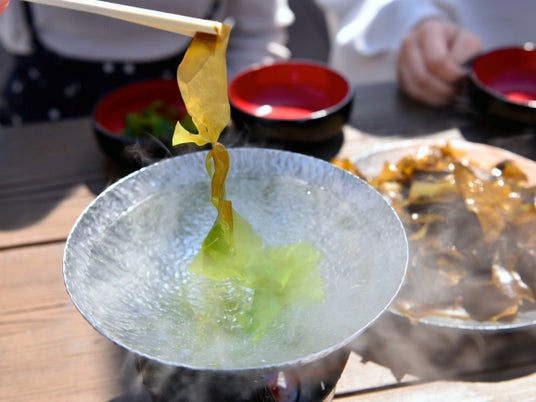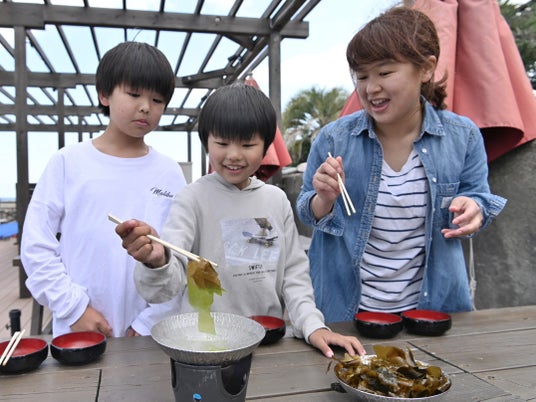 収穫したわかめは“しゃぶしゃぶ”にして試食。茶褐色の生わかめが湯通しされ、鮮やかな緑に変わる瞬間は感動もの。