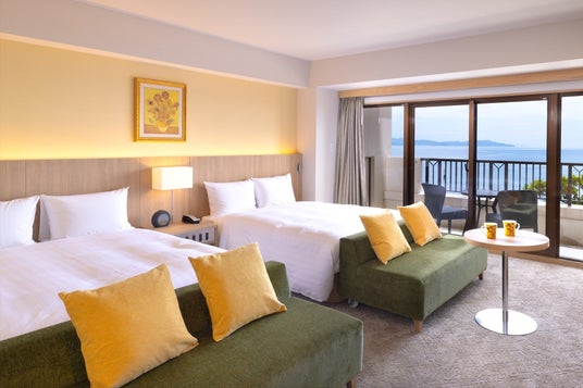 海を見晴らす洋室や和室、徳島の匠による阿波藍ルームなど旅のスタイルで選べる客室は15タイプ。2024年3月に徳島が誇る伝統工芸「大谷焼」アートプレートが彩る客室、7月には泊まれるアートギャラリー「ゴッホのヒマワリルーム」が誕生。