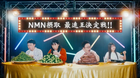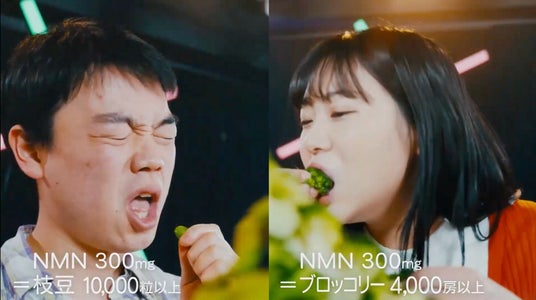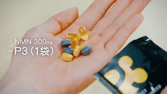 本CMでは、NMN300mgを摂取するために必要な食材量(ブロッコリー、枝豆、ステーキなど)を具体的に示し、「P3」であれば1日1包9粒のサプリメントで簡単に補えることをユーモアを交えながら伝えます。