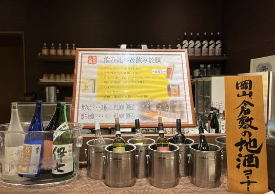 岡山・倉敷の種類豊富な地酒が揃う〇飲み放題2,800円 〇飲み比べ2,000円(3杯)