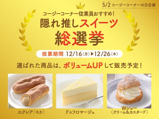 株式会社銀座コージーコーナー<代表取締役社長 船田知秀 東京都中央区>は、2024年12月16日(月)から12月26日(木)まで、投票で選ばれた商品がボリュームUPして商品化されるオンライン投票イベント「コージーコーナー従業員おすすめ!隠れ推しスイーツ総選挙」を公式Xおよび公式アプリで開催します。