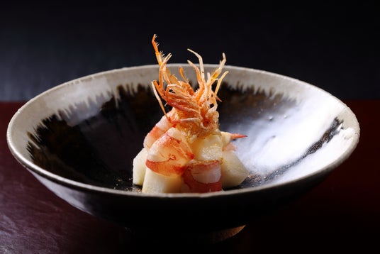 車海老を油霜(*2)にして甘みを引き立たせ、洋梨と酪を合わせました。土佐酢風味のジュレ、殻や頭を丸ごと砕いた海老塩を加えることによって、さっぱりとした酸味と共に海老の風味や旨味が存分に楽しめます。食材を余すことなく使用する日本料理の精神を大切にしながら、フランス料理によく使用される相性の良い食材をかけ合わせて完成した他にはない一品です。