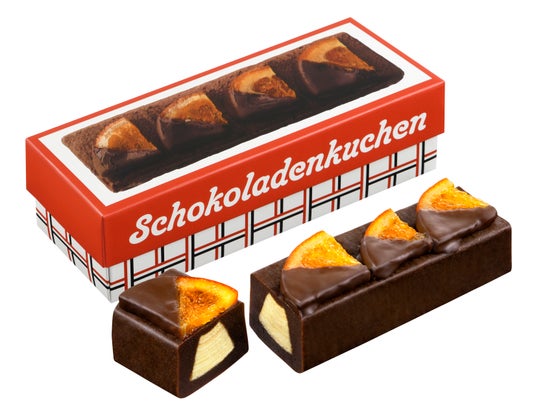 5.ショコラーデンクーヘンバウムクーヘンを中に閉じ込めた濃厚で滑らかな食感のチョコレートケーキはユーハイムならでは。生地には、カカオ分60%のスイス産ダークチョコレートを使用しました。ほろ苦いチョコレートと、天面に飾った甘酸っぱいオレンジの組み合わせも抜群です。