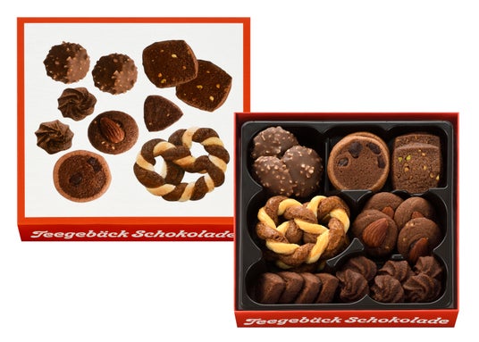 『テーゲベック(チョコレート)』は、通常販売しているテーゲベックに入っているビスケットとは異なり、チョコレート生地をベースにしたビスケットを7種類詰め合わせています。天面に飾ったオレンジがアクセントの『ショコラーデンクーヘン』は、生地にダークチョコレートを使用したみっちり濃厚なチョコレートケーキです。さらに、チョコレートと生クリームを組み合わせた“ガナッシュ”を使用したこの時期限定の濃厚な『ガナッシュバウム』。他にも、サクサクのパイをチョコレートで包んだミルフィーユやひとくちサイズのバウムクーヘンなどチョコレートを使用したお菓子をご用意しました。