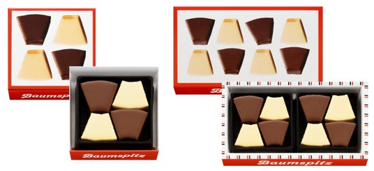 3.4.バウムシュピッツひとくちサイズのバウムクーヘンにジャムをサンドして、チョコレートで包んだロングセラーの季節商品。アンズジャム×ホワイトチョコレートと、クランベリージャム×ミルクチョコレートのアソートです。