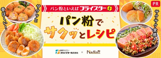 Nadia株式会社(東京都港区/代表取締役社長 葛城嘉紀 以下「Nadia」)とフライスター株式会社(神奈川県横浜市/代表取締役社長 関全男 以下「フライスター」)がタイアップし、フライスター社乾燥パン粉や生パン粉の認知・消費拡大を目的に、特別企画ページ「パン粉でサクッ!とレシピ」を公開いたします。