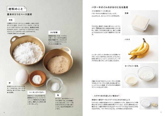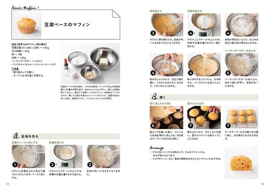 ひとつのボウルに材料をどんどん加えてまぜて焼くだけという手軽さですが、まずは「豆腐ベースのマフィン」で基本の作り方をマスターしましょう。プロセスを写真でていねいに追いかけているので、生地の様子などを、目でしっかり確認して作業できます。