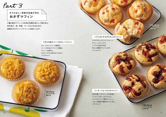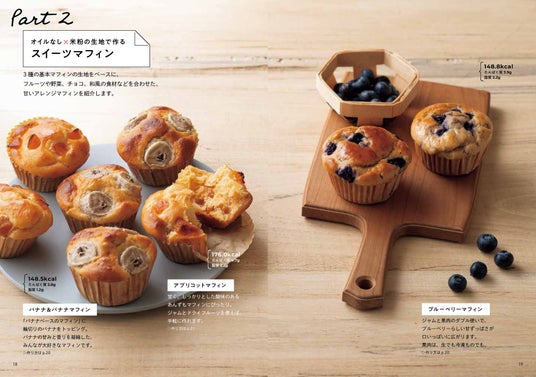 本書では、オイルなしで罪悪感なく食べられる「スイーツマフィン」と甘さを控えてたんぱく質の具材を合わせた「おかずマフィン」をバリエ豊富にご紹介。