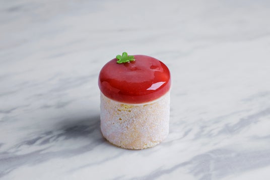 運ばれた瞬間に目を奪われるコロンとしたシェープに真っ赤な艶。甘く香る苺に、華やかでエレガントに昇華させるルバーブの酸味、更にヨーグルトを加えることでナチュラルな苺の味わいを感じて頂けます。可愛らしい見た目のインパクトに続き、一口食べた瞬間に息を呑むような官能的なイチゴの世界に誘う自慢のスイーツです。