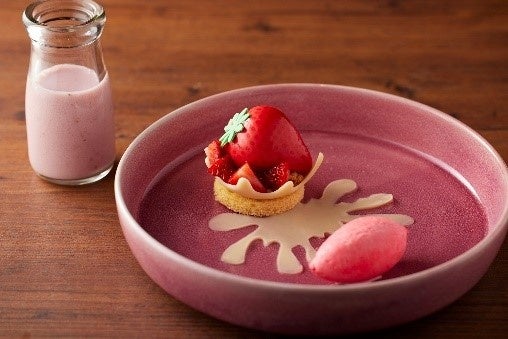いちごがミルクに落ちた瞬間をモチーフにしたデザートは、甘酸っぱいいちごと相性抜群のホワイトチョコレートのハーモニーをお楽しみいただく一品。ラズベリー味でコーティングしたいちごムースに、ミルクのしぶきに見立てたホワイトチョコレートやホワイトチョコレートソース、さらにいちご牛乳に見立てたいちごのミルクソースを添えてご提供いたします。