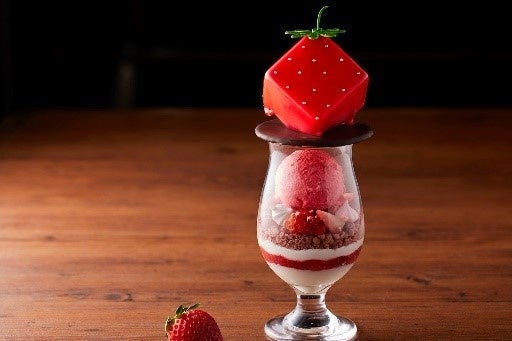 キューブ型のいちごの正体は、フレッシュいちご入りのいちごムース。グラスの中はブラマンジェ、生クリーム、フレッシュいちご、いちごのソルベなどが重なりあい、甘さと酸味、そしてさまざまな食感が絶妙に溶け合います。