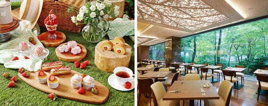 大窓に広がる緑のパノラマが心地いい店内で楽しむガーデンピクニックがテーマのスイーツブッフェ