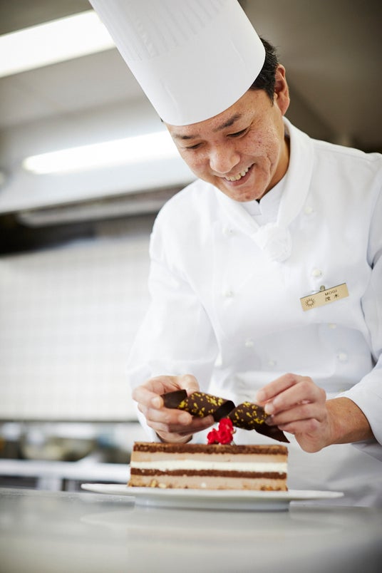 いちごブッフェのメニューを手掛けるのは、シェフパティシエの茂木平太を中心としたパティシエチームです。茂木は、2024年のクリスマスケーキにおいて、大輪のポインセチアが目を引くプランター型ケーキ「アロミ」や、アンティークブックが3冊重ねられた本型ケーキ「ポッロ」などを担当しました。