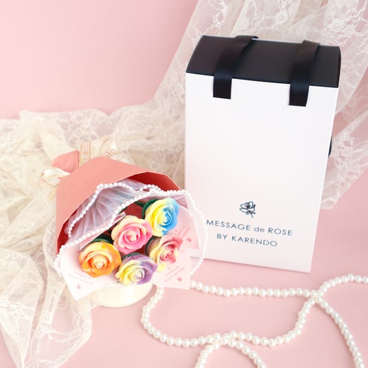 karendoで大人気のお花「レインボーローズ」をチョコレートで再現しました。バラの花びら一枚一枚を忠実に再現するため、バラの形や厚み、曲線の細部に至るまで徹底的にこだわり、最高の口どけを実現。まるで本物の花びらを味わっているかのような繊細な口当たりと、花びらごとに異なる7種類のフルーティで濃厚なチョコレートの風味が口いっぱいに広がります。「レインボーローズ」は『奇跡』『無限の可能性』と素敵な花言葉を持ち、特別なギフトに最適です。目で楽しみ、香りを感じ、そして味わう――五感を満たす贅沢な体験をぜひお楽しみください。