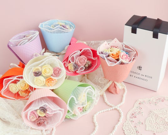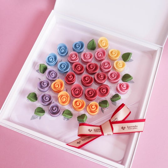 カラフルなバラのチョコレートを花束風に見立てた、目にも華やかなチョコレート。見た目だけでなく、味にもこだわり、独自の製法で果汁をとじこめてしっかりとフルーツを感じられる本格的な味わいです。箱を開けた瞬間に広がる芳醇な果実の香りと、まるでカラフルなお花畑を思わせるような美しいチョコレートは、大切な方へのサプライズギフトにぴったり。味覚と視覚で楽しめる特別な贈り物をぜひお試しください。