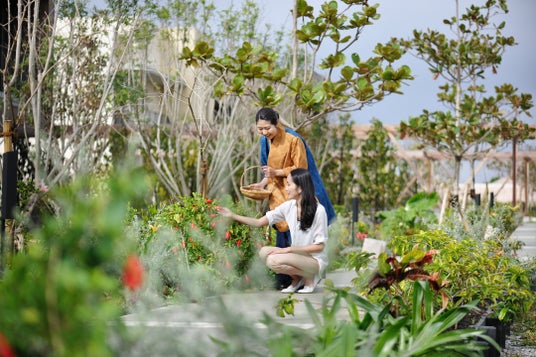 海岸に沿うように1km渡って広がる、星のや沖縄の庭には亜熱帯地域特有の植物が繁り、糸芭蕉や実芭蕉も育っています。到着後に行う「芭蕉布インビテーション」ではスタッフと共に庭を歩き、芭蕉の特性や植物を活かす沖縄の人々の暮らしについて学びます。海からの心地よい風を感じながら、翌日の工房見学に期待を膨らませます。