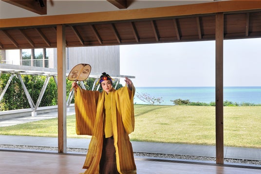 星のや沖縄の道場で、団扇を持ち舞う古典舞踊「作田(つぃくてん)」を鑑賞します。踊り手は特別展で展示されるほど貴重な芭蕉布の衣装をまとい、海を背景に優雅な舞を披露します。風をうける芭蕉布、そして美しい舞と三線の音色に酔いしれながら、琉球王朝時代に想いを馳せます。