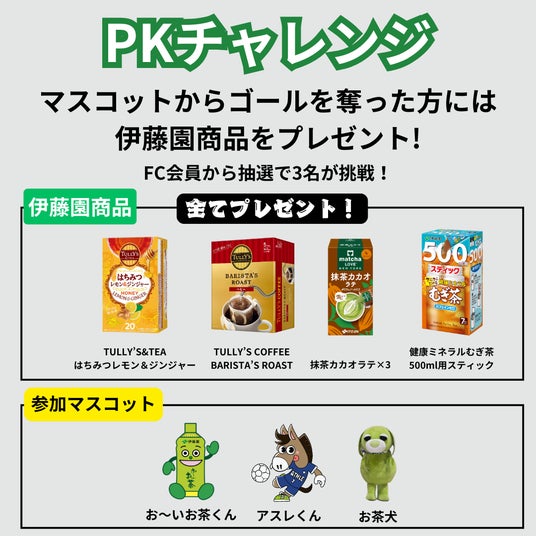 FC会員限定イベントPKチャレンジ立川アスレティックFCのファンクラブ限定イベント「PKチャレンジ」。GKのマスコットからゴールを決めて伊藤園&アスレグッズをゲットしよう。