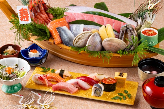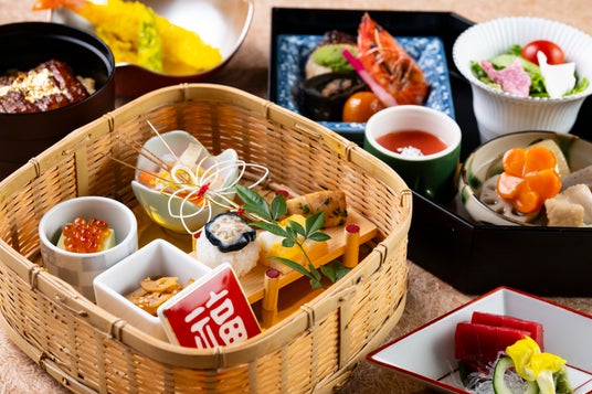 出世魚の鰤、不老長寿の象徴とされる海老や鮑、子孫繁栄を願ういくらや数の子など縁起の良い海の幸や、運気が上昇するうなぎ、立身出世を願う筍などを使い、新鮮な素材を生かしつつ料理長の熟練された技巧でお寿司や天ぷら、中華料理などバラエティ豊かにご提供いたします。2025年の強運カラーを取り入れた彩りも一緒にお楽しみください。