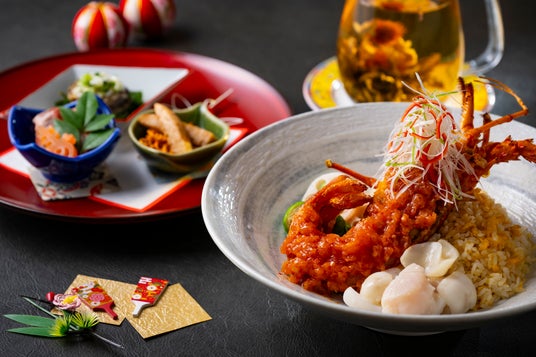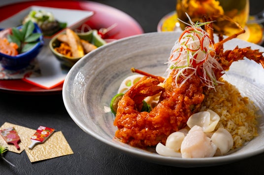 健康長寿を象徴する鮑、子孫繁栄を願う豚肉、招福の意味を持つ筍が前菜プレートを彩ります。伊勢海老の半身を使用したチリソースをメインにランチ、ディナーともにご用意いたしました。