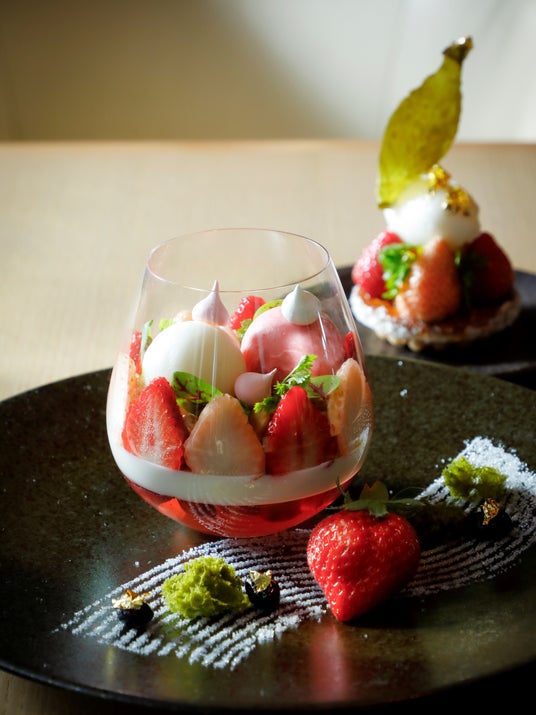 エグゼクティブ ペストリーシェフ 松尾浩幸が考案するデザートは、季節の移ろいを反映し、独創的で繊細な美しさで毎シーズン人気を博してきました。甘みが強く、ほのかにピンク色の淡雪と、甘さと酸味のバランスが絶妙なあまおうの2種のいちごをふんだんに使用し、フレッシュないちごのみならず、アイスクリームやジュレなどにアレンジ。グラスの器の中には食感や、フレーバーにこだわった見た目にも美しい京都のエレメントが散りばめられ、主役のいちごを引き立てます。