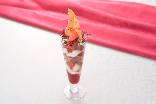 「苺のパフェ」は、なめらかなマスカルポーネ、苺ゼリー、バルサミコとはちみつで甘みを引き立てた苺を層に重ねました。トップにはフランボワーズのシャーベットとヘーゼルナッツのチュイルを乗せています。