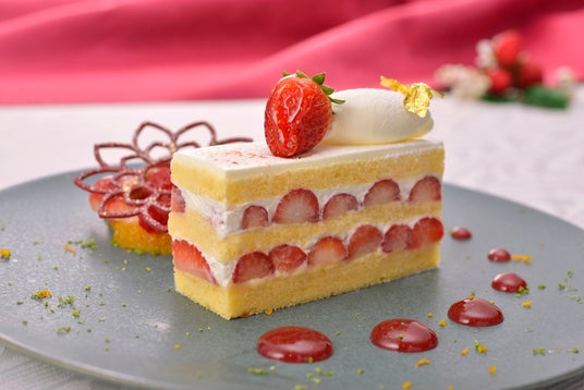 また、軽い口当たりのスポンジに、苺をたっぷりとサンドした断面美が目を引く「苺のショートケーキ」は、生クリームとスポンジの間にカスタードクリームをしのばせ、深みのある味わいに。みかんと苺を添えて苺のヘタをイメージしたチュイルで華やかに仕上げました。
