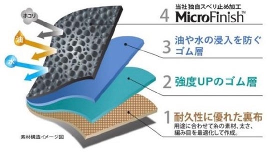 「マイクロフィニッシュ」は、ゴムの層を凹ませて加工するため、水や油が染み込みやすくなる性質があります。その問題を解決するために、東和は独自の特殊4層構造※2(下図)を採用しています。