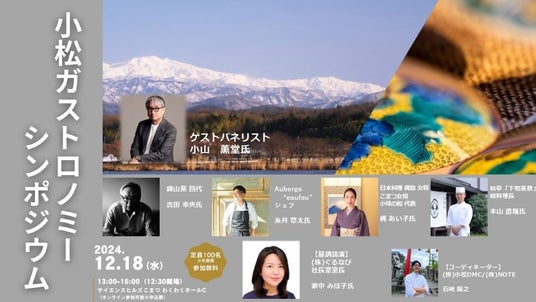 12月18日(水)、石川県小松におけるガストロノミーツーリズムをテーマにした地域一体でのガストロノミーツーリズムを考える「小松ガストロノミーシンポジウム」。本イベントは、小松市が観光庁の「地域一体型ガストロノミーツーリズム推進事業」に採択されたことを受け、その一環として開催されます。「食と器」をテーマに地域の事業者や専門家をゲストに招き、地域の資源を活かした小松ならではのガストロノミーツーリズムについて深く語り合うイベントです。