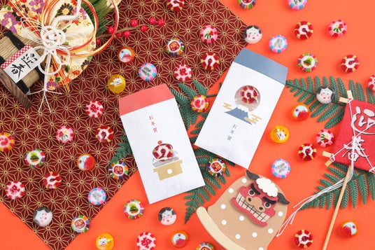 ●お年賀ぽち袋富士山と鏡餅柄のぽち袋に、干支飴(み)の他に、赤富士や福笑いなど縁起の良い飴がランダムで入っています。
