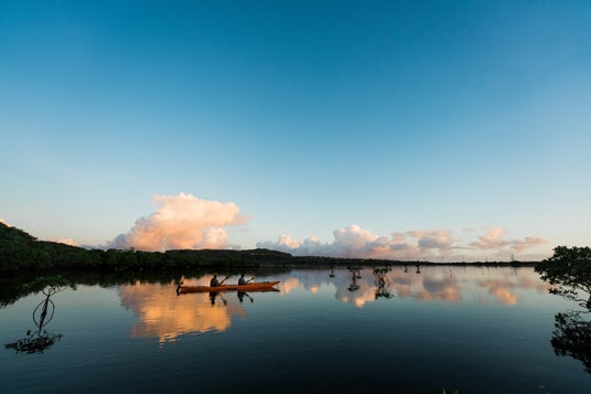 早朝のマングローブ林の川には、カヤックを漕ぐ音と自然の音だけが響きます。風と川の流れが止まった朝凪の時間には、刻々と空の色が変わり、流れる雲や朝焼けが水面鏡のように映し出される、早起きをしたからこその幻想的な絶景を楽しめます。生き物や人も活動を始める前の静寂な時間に、視界の開けた川やトンネルのように木々で囲まれた川などその日の風向きを見ながらフィールドを熟知したガイドが案内します。マングローブ林の川をゆったりと進めば、朝凪の静寂とマングローブの神秘を心ゆくまで満喫できます。まるで自然と一体になれるような体験です。