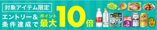 ソフトドリンク・お酒・日用品・フードの4カテゴリーのうち、3カテゴリー以上の対象アイテムを1個以上購入するとポイント10倍(通常ポイント1倍+特典ポイント9倍)