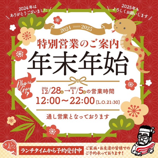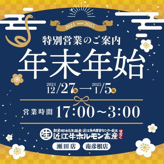 株式会社総合近江牛商社(本社:滋賀県守山市/代表取締役社長:西野 立寛)が運営する【近江焼肉ホルモンすだく】は、年末年始の2024年12月28日~2025年1月5日の期間中、直営店舗では12時~22時まで営業いたします。