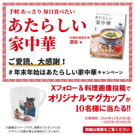 株式会社マガジンハウス(本社:東京都中央区、代表取締役社長:鉄尾周一)は、note「おうちで中華」で人気の中華料理愛好家・酒徒さんの料理本『手軽 あっさり 毎日食べたい あたらしい家中華』の大好評を受け、2024年12月20日(金)より「オリジナルマグカップが当たる!“年末年始はあたらしい家中華”キャンペーン」を実施いたします。本書は第11回料理レシピ本大賞 in Japanでダブル受賞を果たし、手軽に作れる中華料理レシピとして多くの読者に支持されています。この機会に、本書を使って年末年始をさらに豊かにする料理をお楽しみください。