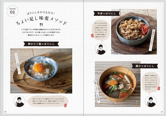 各レシピには「おつまみ」や「お弁当」に活用できるものにはマークをつけ、また4種類の「ほりにし」との合性も掲載。さらに、ちょい足し味変レシピから調味料レシピ、スイーツレシピまで、とことん「ほりにし」を味わって楽しめるレシピ集となっています。
