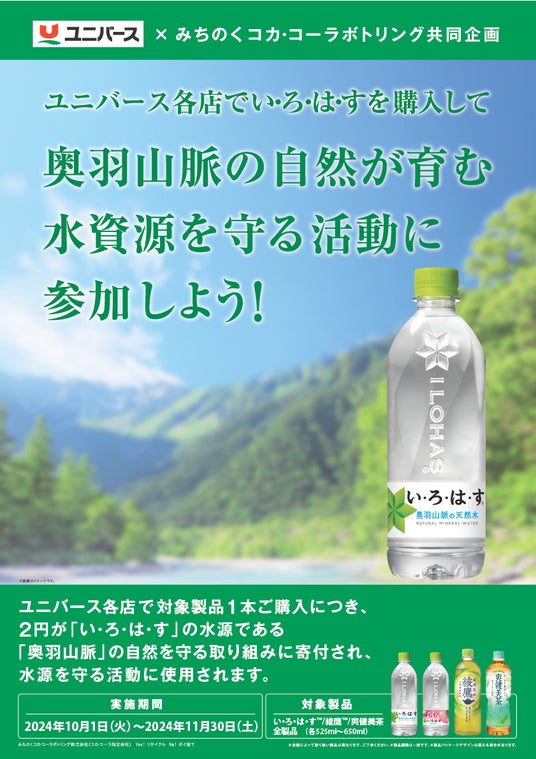 このキャンペーンは、2024年10月1日(火)から11月30日(土)までの期間、ユニバース59店舗において展開し、期間中の対象製品1本ご購入につき2円が豊沢川土地改良区へ寄付され、「い・ろ・は・す」の水源を守るための環境保全活動などに役立てられるものです。このたびの対象製品は「い・ろ・は・す」、「綾鷹」、「爽健美茶」の3ブランド13品目とし、売上本数は356,429本、寄付金額は712,858円となりました。なお、2018年から開始したこの取り組みによる寄付金の総額は、このたびのものを含め3,336,546円となります。