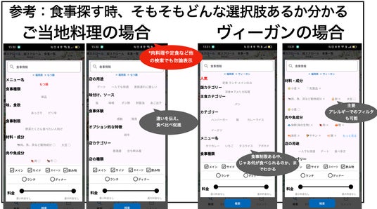 何か食べたい時、その制限の中で、更に味や食感など細かく店による違いが分かり、そこから更に絞り込みできるため、ご当地料理を探したい時や、ヴィーガンなど食制限がある前提での店検索が容易になる。
