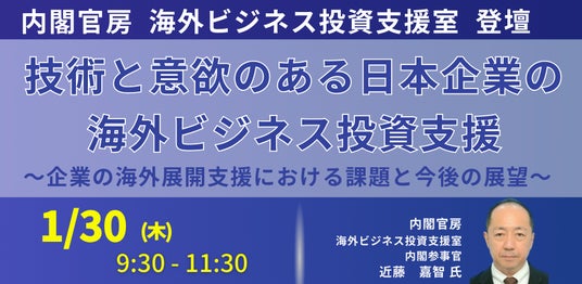JPI(日本計画研究所)は、内閣官房 海外ビジネス投資支援室 内閣参事官 近藤 嘉智 氏を招聘し、技術と意欲のある日本企業の海外ビジネス投資支援について詳説いただくセミナーを開催します。