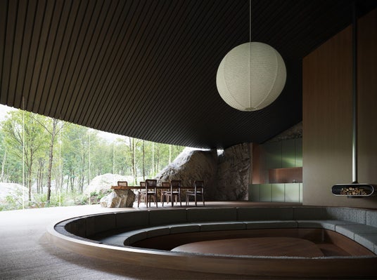 家の形状は不完全な楕円であり、地形に溶け込むように設計されています。この有機的な形状により、家は地面から控えめに浮かび上がり、岩によって機能的な支持と美的なアンカーとして支えられます。下部のファサードは主にガラスで構成され、風景の広大な眺望を枠に収め、自然光が内部に入り込むようにしています。このように、設計は自然と人工の要素をシームレスに統合し、環境に敬意を払い、その風景を映し出す家を実現しています。