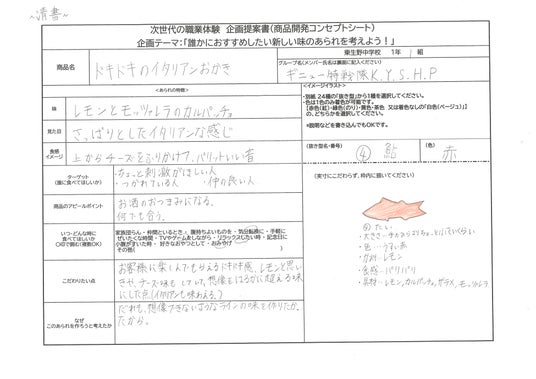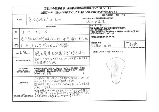 東生野中学校1年生全員が18グループに分かれて案を出し合い、1つだけ実際に商品化するという企画です。