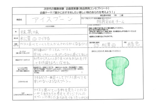 18グループもあるので、様々な案があり「先生や親に普段のストレスを軽くするために甘いあられを考えました」とか「仕事を頑張った人にお酒のおつまみとして」とか「アイス用でスプーン型の抹茶あられを作りたい」など明確に人のために役立つことを意識してるんだなあと感心しました。