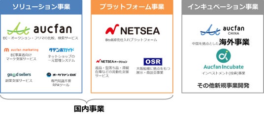 国内事業においては、創業来培った売買データにより、価格と販路を最適化する「aucfan.com(オークファン)」、小売・流通業向けのプラットフォーム「NETSEA(ネッシー)」「NETSEAオークション」等をSMB(中小企業・個人事業主)向けに展開しております。