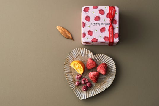 フリーズドライのフルーツにチョコレートを浸み込ませた「しみこみショコラ」。定番人気のストロベリーのほか、ラズベリーと静岡県産青島みかんの新味2種を詰め込んだ、彩り鮮やかなバレンタイン限定アソートです。