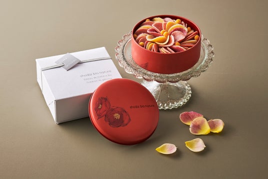 パリッとした食感のペタルチョコレートは、舌の上でふわりと溶ける薄さ。椿の絵が描かれた、鮮やかな赤色の限定デザインの缶にベリーを中心とした甘酸っぱいテイストのチョコレートを詰めました。